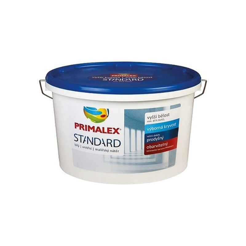 Interiérová barva (omítky, sádrokarton, dřevotříska, OSB desky). Primalex STANDARD je tradiční a stále žádaný produkt značky Primalex v oblasti vnitřních malířských nátěrů, který splňuje veškeré základní požadavky na užitné vlastnosti běžných, nenáročných prostor.