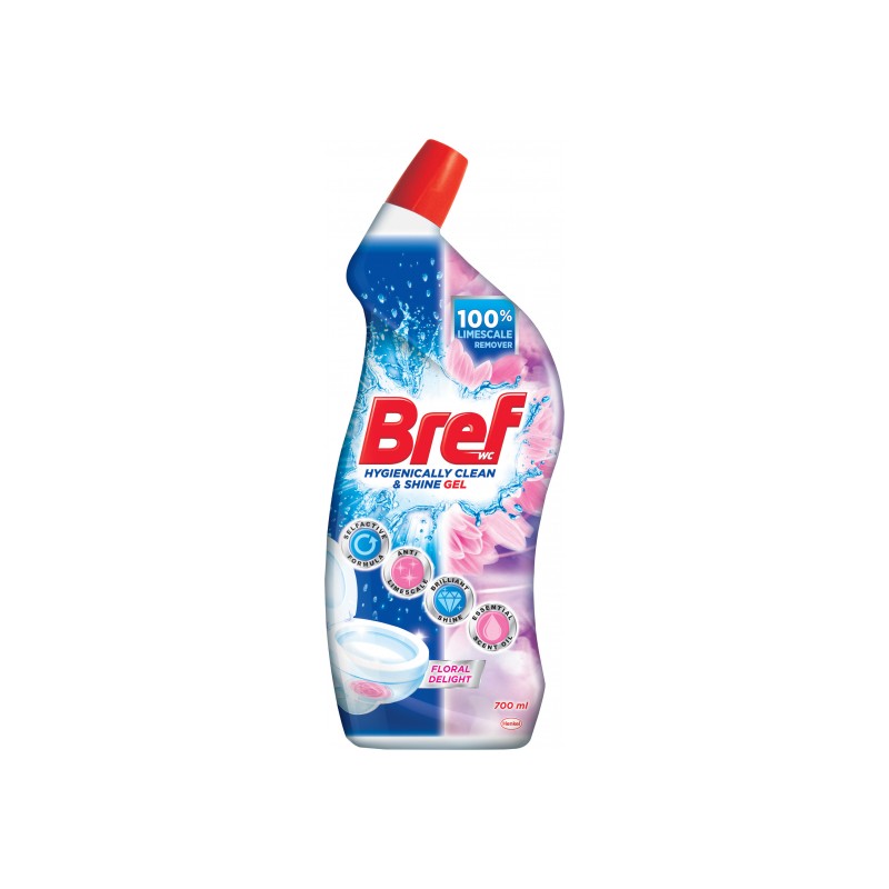 Bref gelový WC čistič díky silnému složení účinnému zejména proti vodnímu kameni zajišťuje hygienickou čistotu a lesk vaší toalety. WC čistič po aplikaci dodá vaší toaletě také příjmenou vůni. Automaticky se aktivuje při kontaktu s povrchem, hygienicky čistí, bělí a příjemně voní esenciálními oleji.